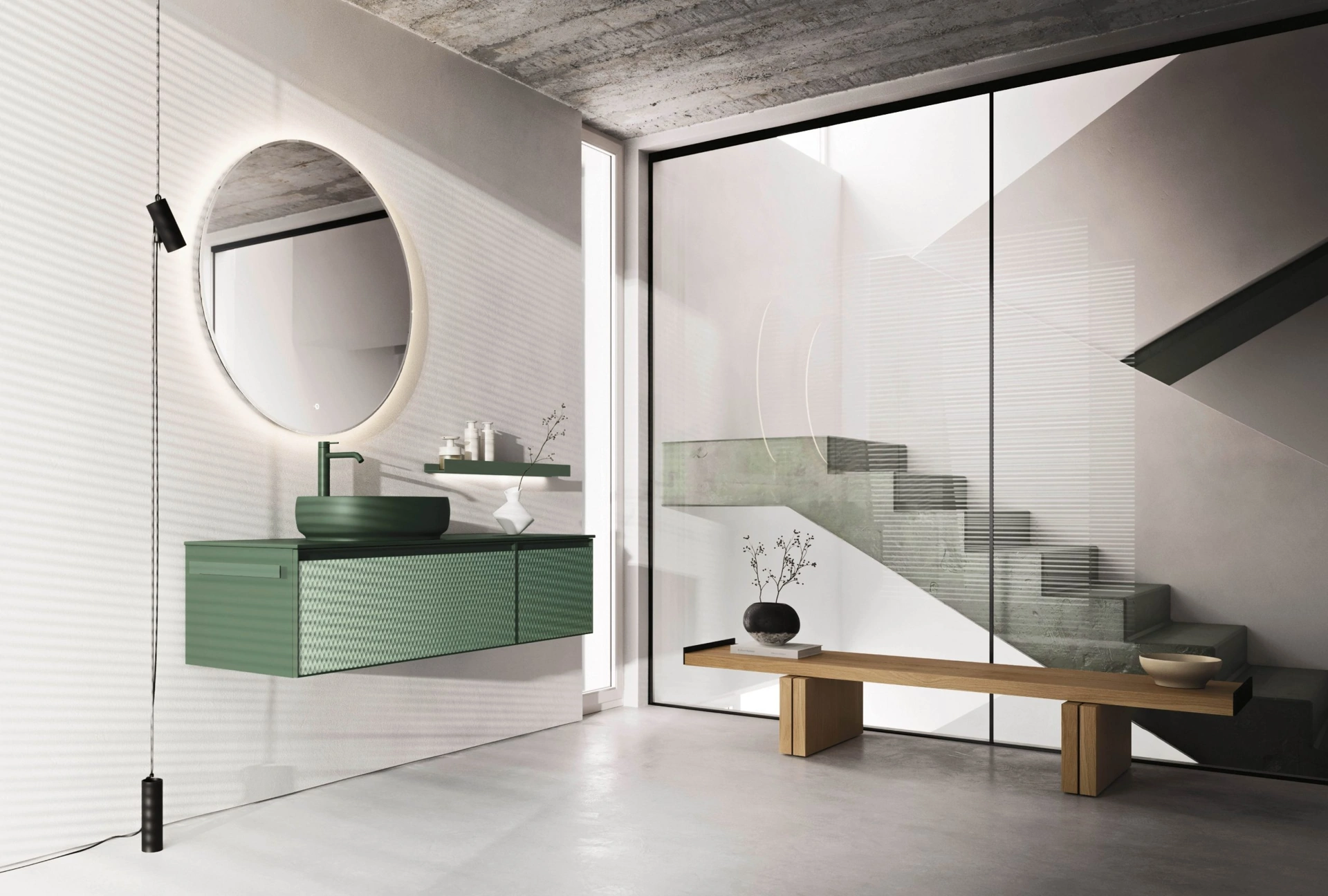 mobili bagno sospesi in laccato opaco del brand Arbi: clicca e scopri l'arredo bagno design Absolute 44 per la stanza del benessere.