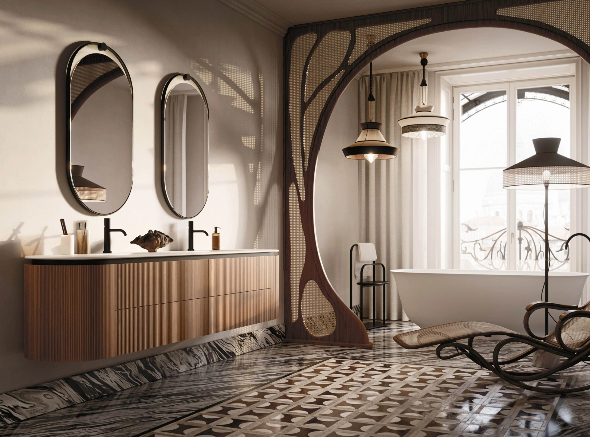 mobili bagno sospesi in legno del brand Arbi: clicca e scopri l'arredo bagno design Almond 07 per la stanza del benessere.