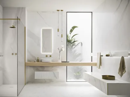 Mobili bagno sospesi in legno della marca Arbi: clicca e scopri l'arredo bagno design Code Wave 07 per la stanza del benessere.