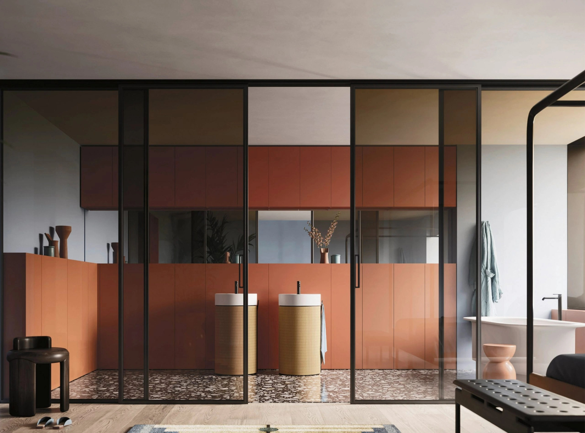 Arreda il bagno di casa moderno ottimamente con Over 06, mobili bagno a terra e oggetti in laccato opaco di Arbi.