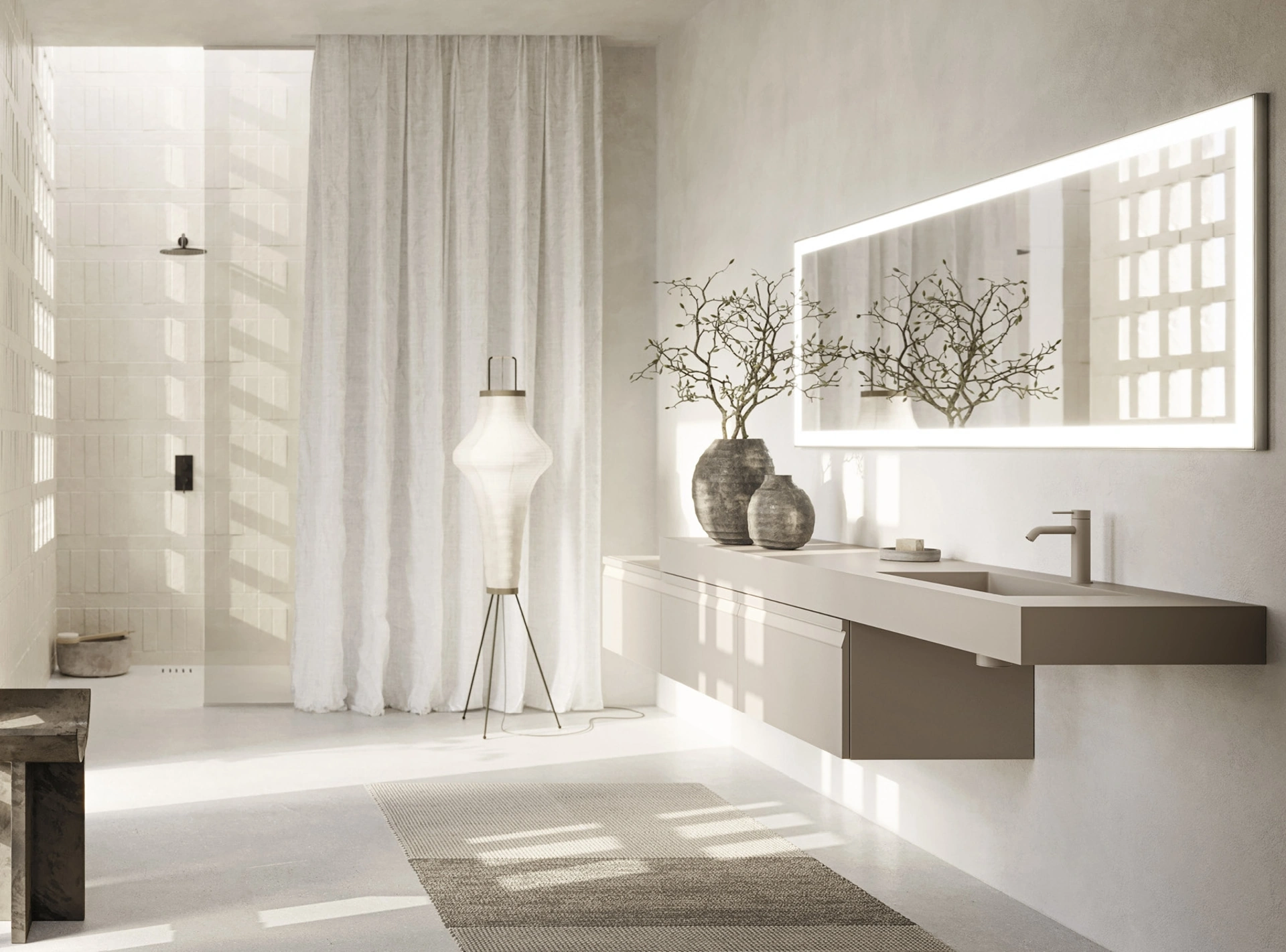 Arreda la stanza del benessere moderno perfettamente con Sky Hook 38, mobili bagno sospesi e accessori in laccato opaco di Arbi.