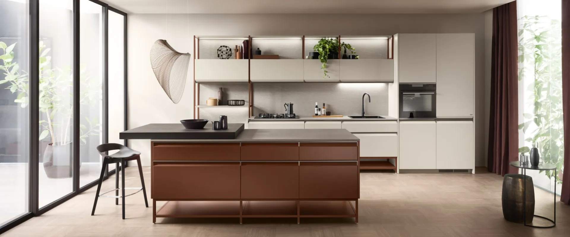 Scopri di più sulla cucina Formalia in Grigio Chiaro e Ruggine di Scavolini: questa soluzione in laccato opaco sarà la scelta ideale per te!